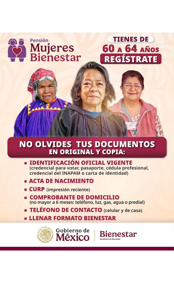 Los requisitos para el registro a la Pensión Mujeres Bienestar son, en original y copia: