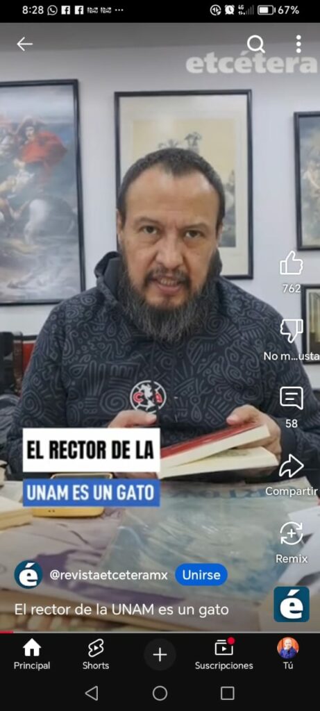 En un gráfico con el que inició una mini videocolumna, el director de la revista Etcétera, Marco Levario Turcott, que se ha distinguido por su posición crítica a la 4T, llama gato al rector de la UNAM, luego que se diera a conocer el comunicado con el posicionamiento de la universidad luego del fallo judicial que le impide cualquier acción que “afecte los derechos de Yasmín Esquivel”.