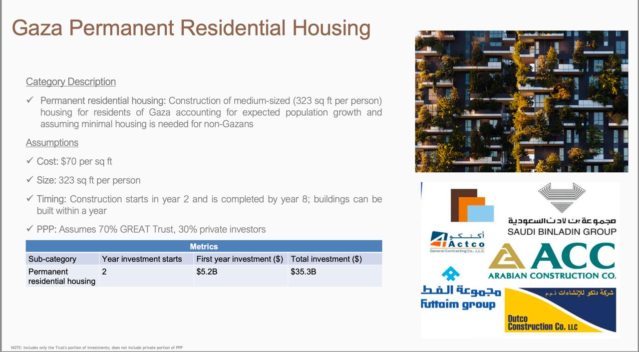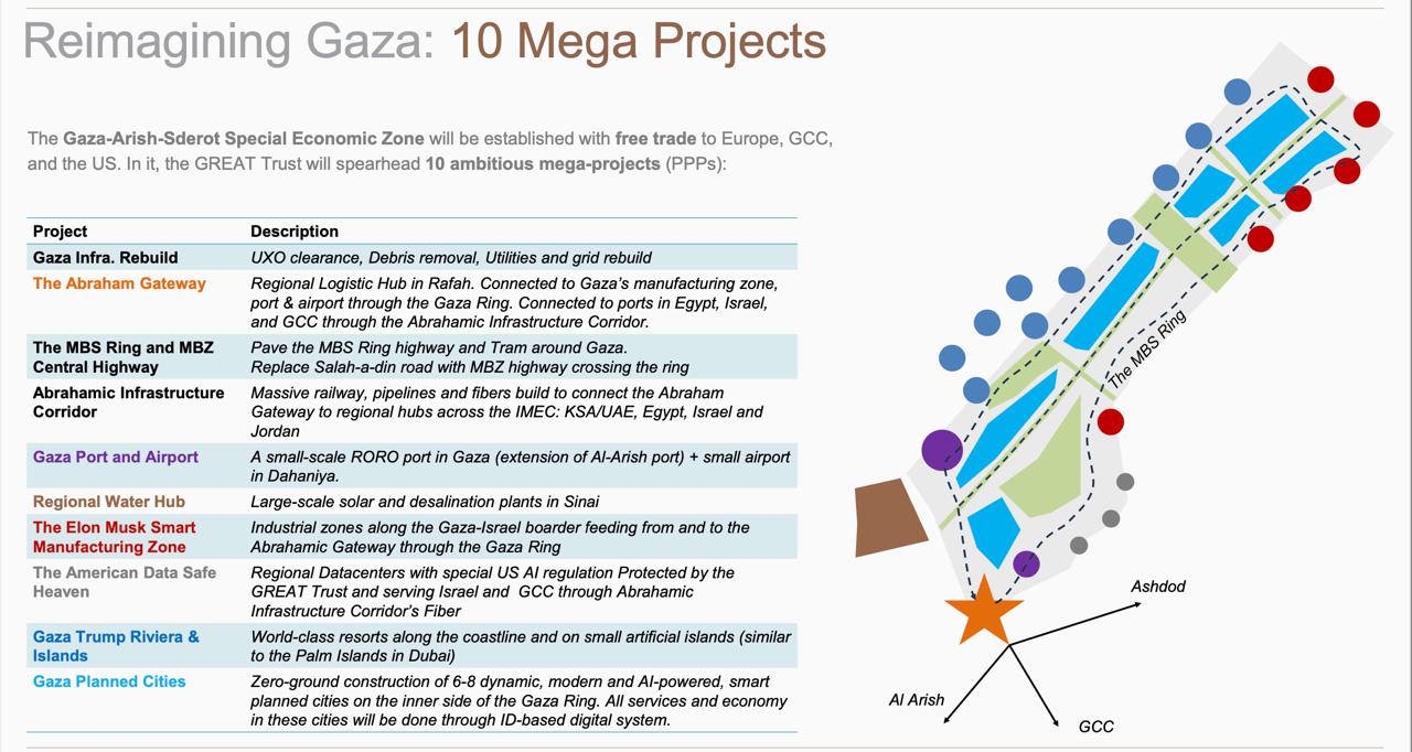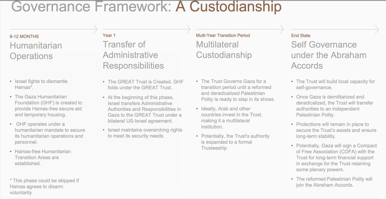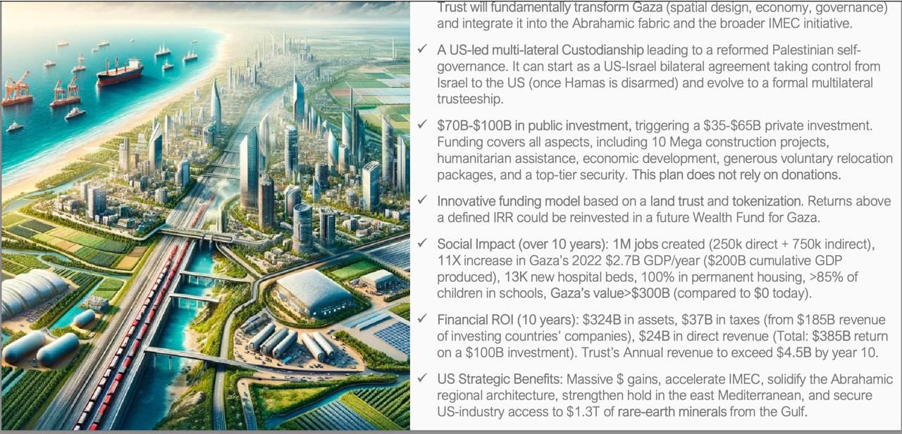 De acuerdo al plan del GREAT Trust, obtenido y difundido por las periodistas Karen DeYoung y Cate Brown del diario Washington Post, el territorio de Gaza arrebatado a los palestinos quedaría bajo “protección” de Estados Unidos durante 10 años, en que sería gobernado por una autoridad multi-nacional (posiblemente como mencionamos, el ex primer ministro Tony Blair, Jared Kushner, yerno del presidente Trump y otros, entre los que no se ha decidido un representante palestino) y por un Fondo Fiduciario “que tiene un ambicioso plan”, que asegura, generaría ganancias superiores a los 100 mil millones de dólares en 10 años.