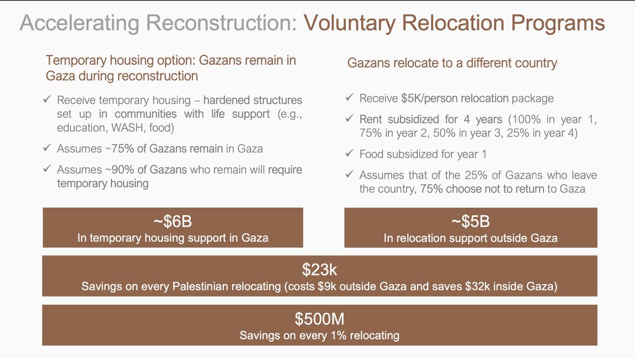 Bajo el proyecto, más de dos millones de palestinos residentes de Gaza “serían reubicados” de manera temporal o definitiva; voluntariamente al extranjero, recibiendo 5 mil dólares en efectivo y apoyo de renta durante 4 años, en zonas de seguridad restringida, o en el país que escojan para vivir y los reciba.
