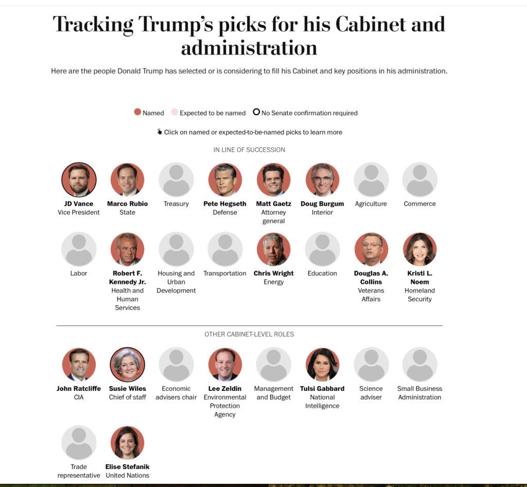Aunque un buen numero de ellos, podría no tener objeciones en las audiencias para su confirmación en el Senado, como exige la Constitución, Trump pidió al nuevo líder, John Thune, facilitar la opción de “nominaciones poor receso”, que evitarían que quienes seleccionó para su Gabinete, no enfrenten el rechazo y obstrucción del Senado.