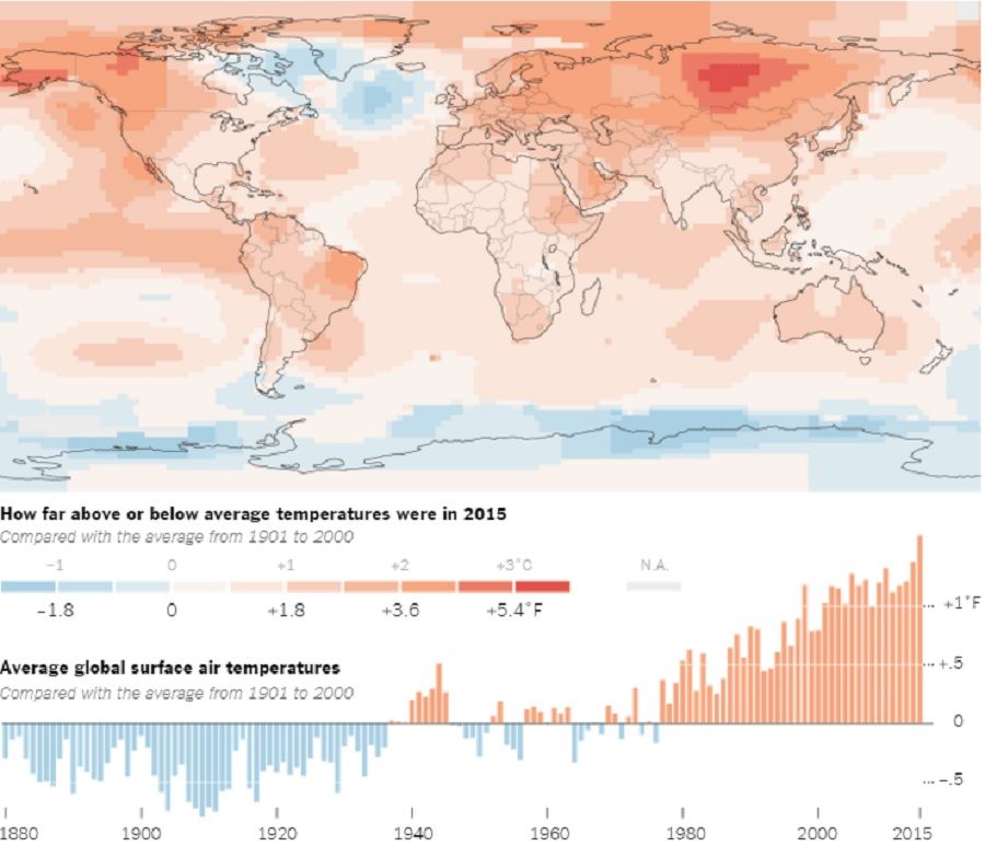El avance es sumamente significativo: durante 2015, la temperatura promedio global sobre superficies terrestres y oceánicas fue de 58.62 grados Fahrenheit (14.79 C grados centígrados), lo que significa que tan solo el año pasado, se registró un incremento global de la temperatura de 1.62 grados Fahrenheit (0.90 grados centígrados).
