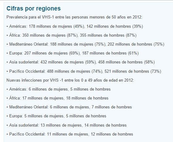 Según los datos de la OMS, cerca de 140 millones de personas entre 15 y 49 años están infectadas con VHS-1 genital, principalmente en América, Europa y el Pacífico Occidental.